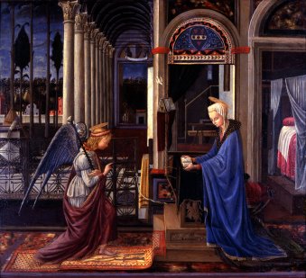 Painted for Jacques Coeur, finance minister of King Charles VII and the richest man in France, The Annunciation is riddled with interior spaces and architecture that is reminiscent of Michelozzo Michelozzi, architect to the Medicis. It boasts grillwork that recalls the Florentine sculptor and bronze founder Maso di Barolomeo and is replete with Marian symbols. As a sop to its patron, a merchant with investments in the eastern Mediterranean, the scene is graced with a slender oriental rug upon which the angel genuflects.