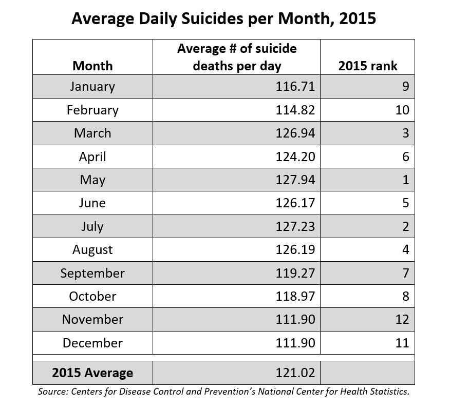 Table 1. Average number of suicides per day in each month in 2016. Source: Center for Disease Control and Prevention’s National Center for Health Statistics.